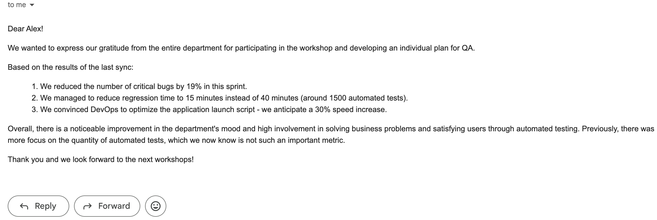 Example of feedback from the company